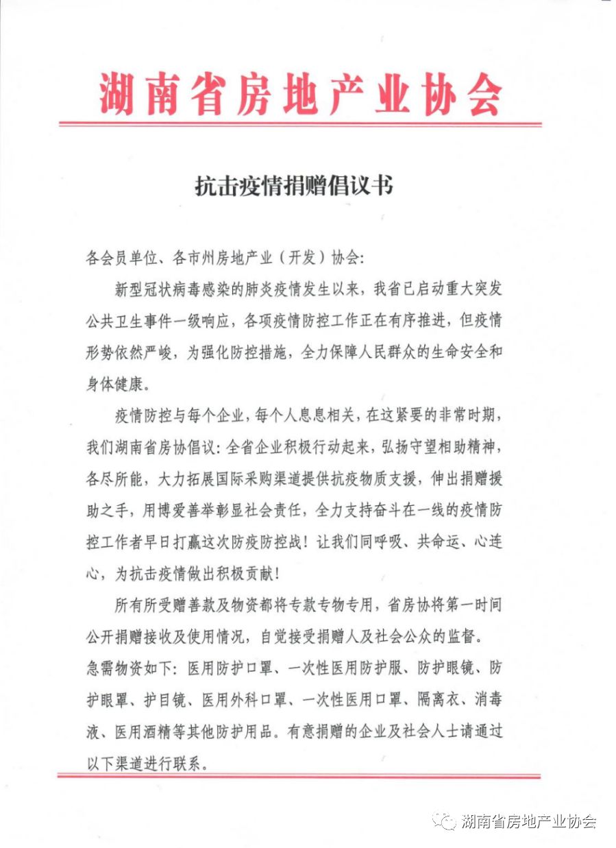 一方有难,八方支援,抗击疫情,共克时艰!倡议发出后,各开发会员单位积极响应,奉献爱心!截止至2月21日,全省共17家省房协开发会员单位加入爱心捐赠队伍,其中大汉城镇建设有限公司捐赠口罩20000个;湖南保利房地产开发有限公司捐赠2500ml的酒精100瓶、20KG消毒液的80桶;湖南省中欣房地产开发集团有限公司捐赠护目镜200副、酒精50桶、方便面20箱、口罩1000个;长沙双瑞房地产开发有限公司捐赠价值20000元口罩;长沙方略投资发展有限公司捐赠价值10000元口罩等等(详见附件)……