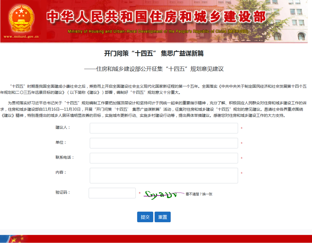 为贯彻落实好习近平总书记关于“十四五”规划编制工作要把加强顶层设计和坚持问计于民统一起来的重要指示精神,充分了解、积极回应人民群众对住房和城乡建设工作的诉求,住房和城乡建设部自11月16日-11月30日,开展“开门问策‘十四五’ 集思广益谋新篇”活动,征集对住房和城乡建设“十四五”规划的意见建议??仪肷缁岣鹘缰氐阄啤督ㄒ椤肪?,特别是提出的城乡人居环境明显改善的目标,实施城市更新行动、实施乡村建设行动等,提出具体举措建议。感谢您对住房和城乡建设工作的大力支持。