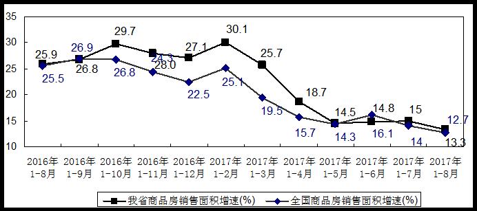 图1:全省商品房销售面积增速与全国商品房销售面积增速