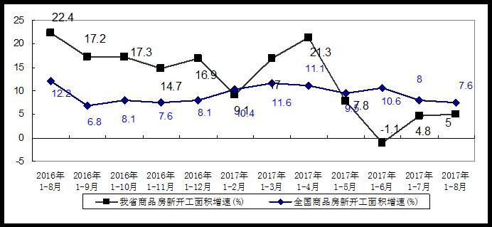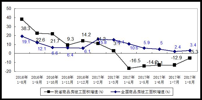 图2:全省房地产开发投资增速与全国房地产开发投资增速 名称 房地产开发投资(亿元) 排名 增幅 (%) 排名 湖南省 2031.56 15.9 长沙市 993.48 1 26.1 3 株洲市 178.40 2 10.8 6 常德市 107.44 3 33.6 1 湘潭市 98.15 4 28.1 2 郴州市 97.68 5 -10.2 12 衡阳市 93.29 6 5.6 8 邵阳市 90.75 3 3.3 11 岳阳市 89.56 8 19.3 5 怀化市 76.64 9 5.3 9 永州市 67.58 10 24.4 4 益阳市 54.24 11 9.4 7 娄底市 39.03 12 -28.2 13 湘西州 22.86 13 -31.8 14 张家界市 22.47 14 4 10 表2.2017年1-8月全省各市州房地产开发投资情况表 (三)商品住宅去化周期明显缩短,非住宅库存去化压力仍较大。据省住房城乡建设厅调查,按照最近12个月月均销售速度测算,截至8月底,全省待售商品房(指累计已办理预售许可或现房销售备案但尚未销售的商品房)库存去化周期10.7个月,环比减少0.3个月,较2016年底缩短4.1个月,较2015年底缩短9.3个月。其中:住宅去化周期6.2个月,较2016年底缩短3.6个月;非住宅去化周期39.4个月,较2016年底缩短10.7个月。 (四)长沙市房价同比涨幅持续收窄,岳阳市、常德市房价同比涨幅逐月扩大。8月,全省新建商品住宅均价4785元/平方米,在全国排名第27位。国家统计局数据显示,8月,长沙市新建商品住宅均价同比上涨16.9%,已连续3个月涨幅收窄,较7月收窄1.4个百分点。岳阳市新建商品住宅均价同比上涨10.7%,已连续3个月涨幅扩大,较7月扩大0.5个百分点。常德市新建商品住宅均价同比上涨10.1%,已连续6个月涨幅扩大,较7月扩大0.7个百分点。 (五)新开工面积小幅回升,竣工面积持续负增长。全省商品房施工面积28603.78万平方米,同比增长3.8%,增速较去年同期收窄4.3个百分点,与1-7月持平。商品房新开工面积4750.82万平方米,同比增长5%,增速较1-7月提高0.2个百分点。新开工面积总量、增速在全国排名第10位、第14位,在中部地区均排名第4位(见图3)。商品房竣工面积2396.95万平方米,同比减少5.3%,已连续5个月负增长,降幅较1-7月收窄7.6个百分点(见图4)。 其中:住宅施工面积20408.42万平方米,同比增长3.8%,住宅新开工面积3452.8万平方米,同比增长11.3%,住宅竣工面积1790.34万平方米,同比减少6.8%;非住宅施工面积8195.36万平方米,同比增长4 %,非住宅新开工面积1298.02万平方米,同比减少8.8%,非住宅竣工面积606.61万平方米,同比减少0.7%。
