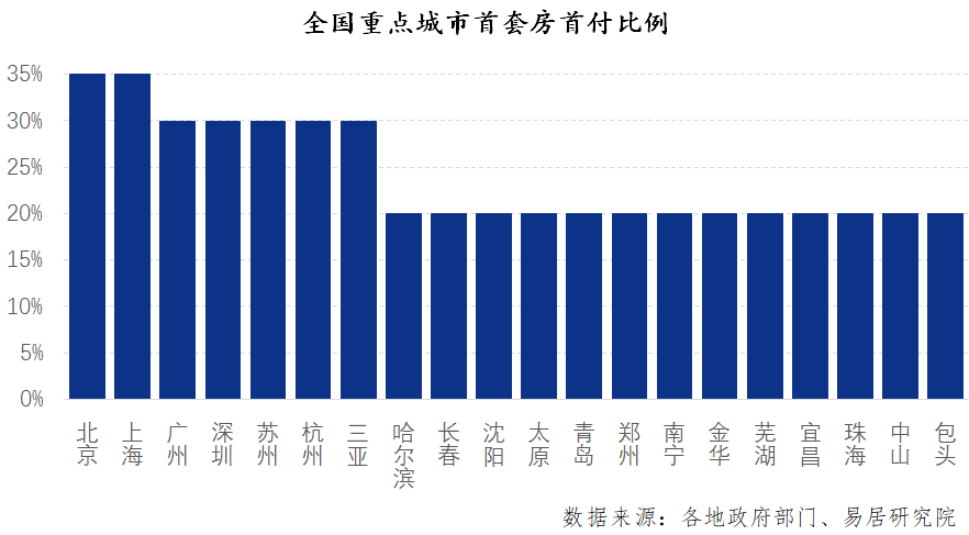 根据易居研究院监测,目前全国20个重点城市首套房首付比例平均值为24%,首付比例主要分为35%、30%和20%三档。