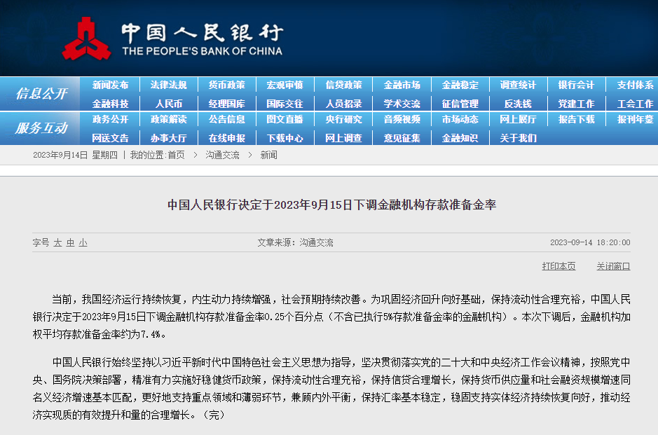据中国人民银行官网最新消息,当前,我国经济运行持续恢复,内生动力持续增强,社会预期持续改善。为巩固经济回升向好基础,保持流动性合理充裕,中国人民银行决定于2023年9月15日下调金融机构存款准备金率0.25个百分点(不含已执行5%存款准备金率的金融机构)。本次下调后,金融机构加权平均存款准备金率约为7.4%。