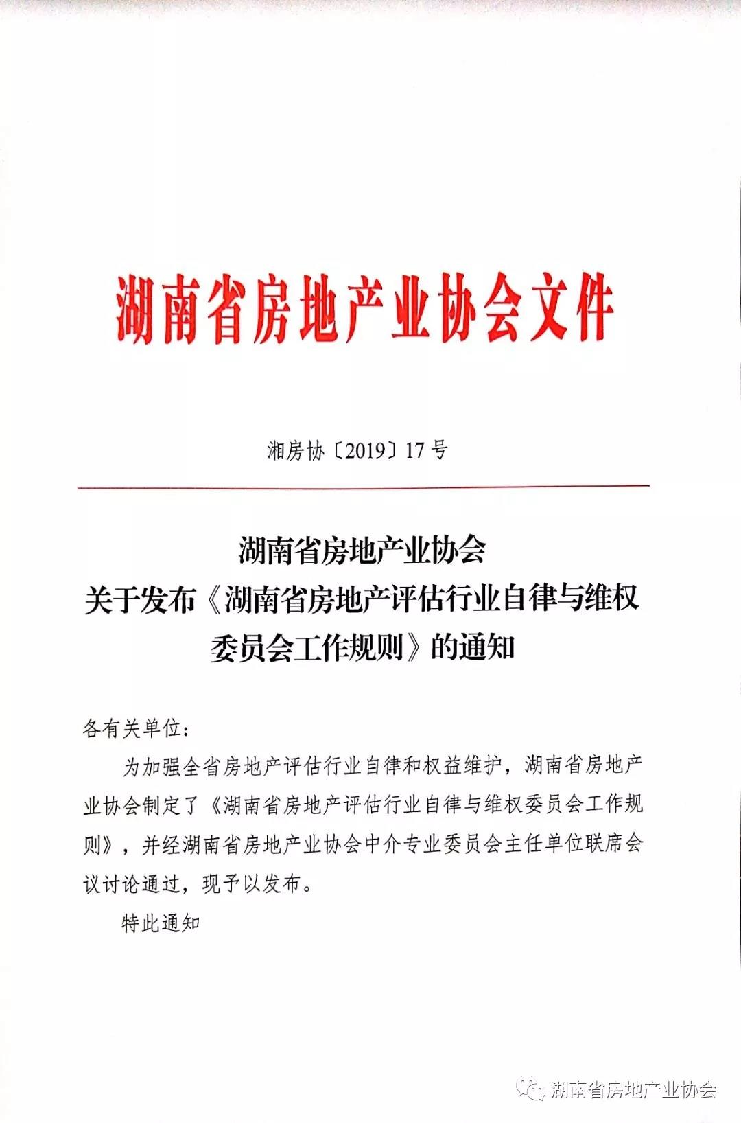 关于发布《湖南省房地产评估行业自律与维权委员会工作规则》的通知