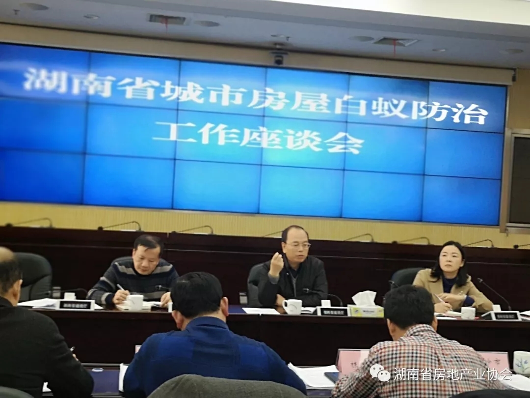 各市州分管领导交流了白蚁防治机构改革情况,交流了白蚁防治工作的成效与主要做法,探讨了工作中面临的主要问题,明确了下步工作重点,提出了相关建议意见?;嵋槿衔?,白蚁防治事关房屋住用安全,要认真落实《湖南省住房和城乡建设厅关于进一步做好城市房屋白蚁防治工作的通知》文件精神,要进一步做好新建、改建、扩建、装饰装修等房屋的白蚁预防和原有房屋的白蚁检查与灭治的管理工作;白蚁防治工作既是一项公益事业,又是一项民生工程,白蚁防治单位要进一步强化服务意识,简化办事流程,为民办好事、办实事;要加强部门协调沟通,落实好白蚁防治工作经费。