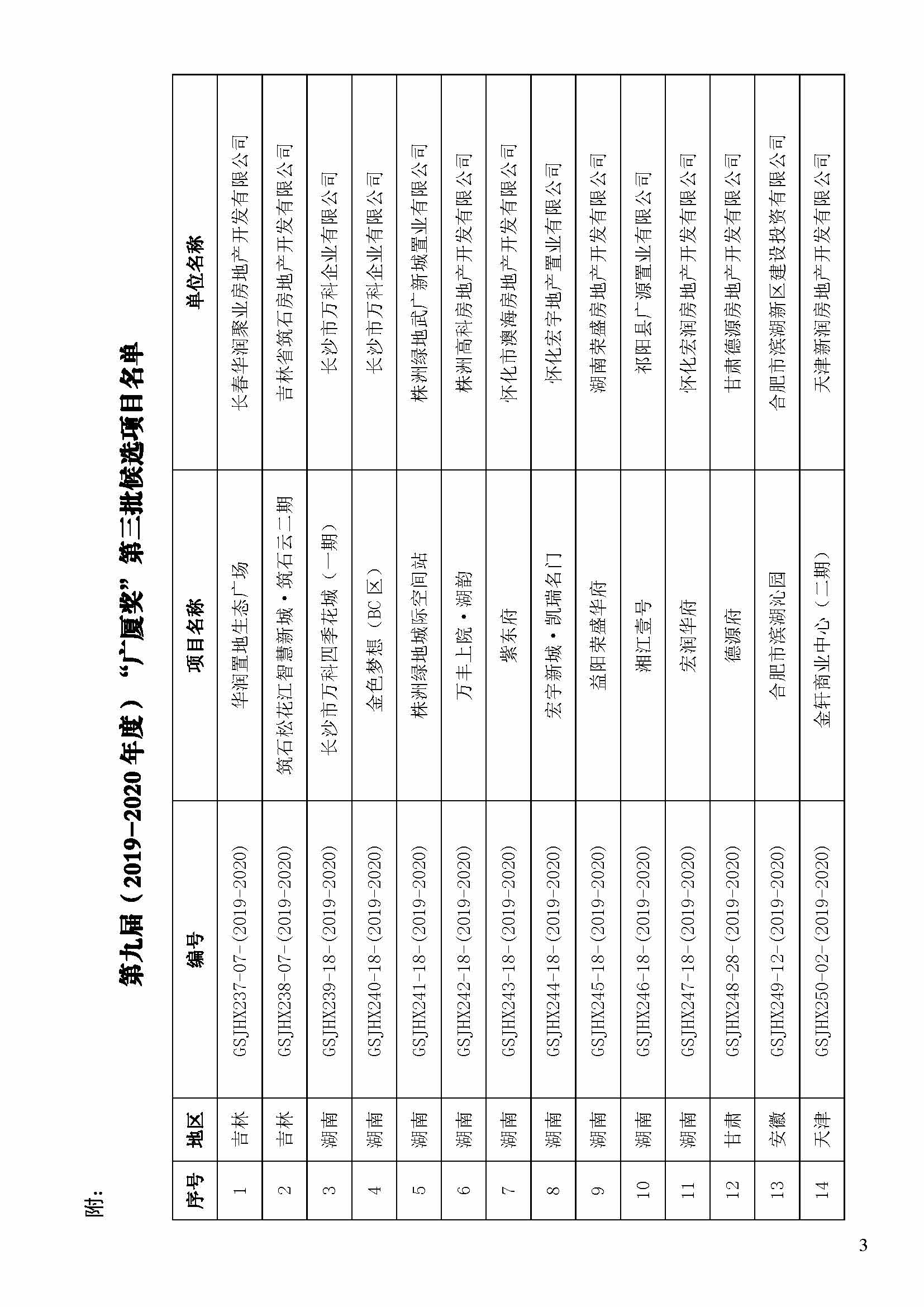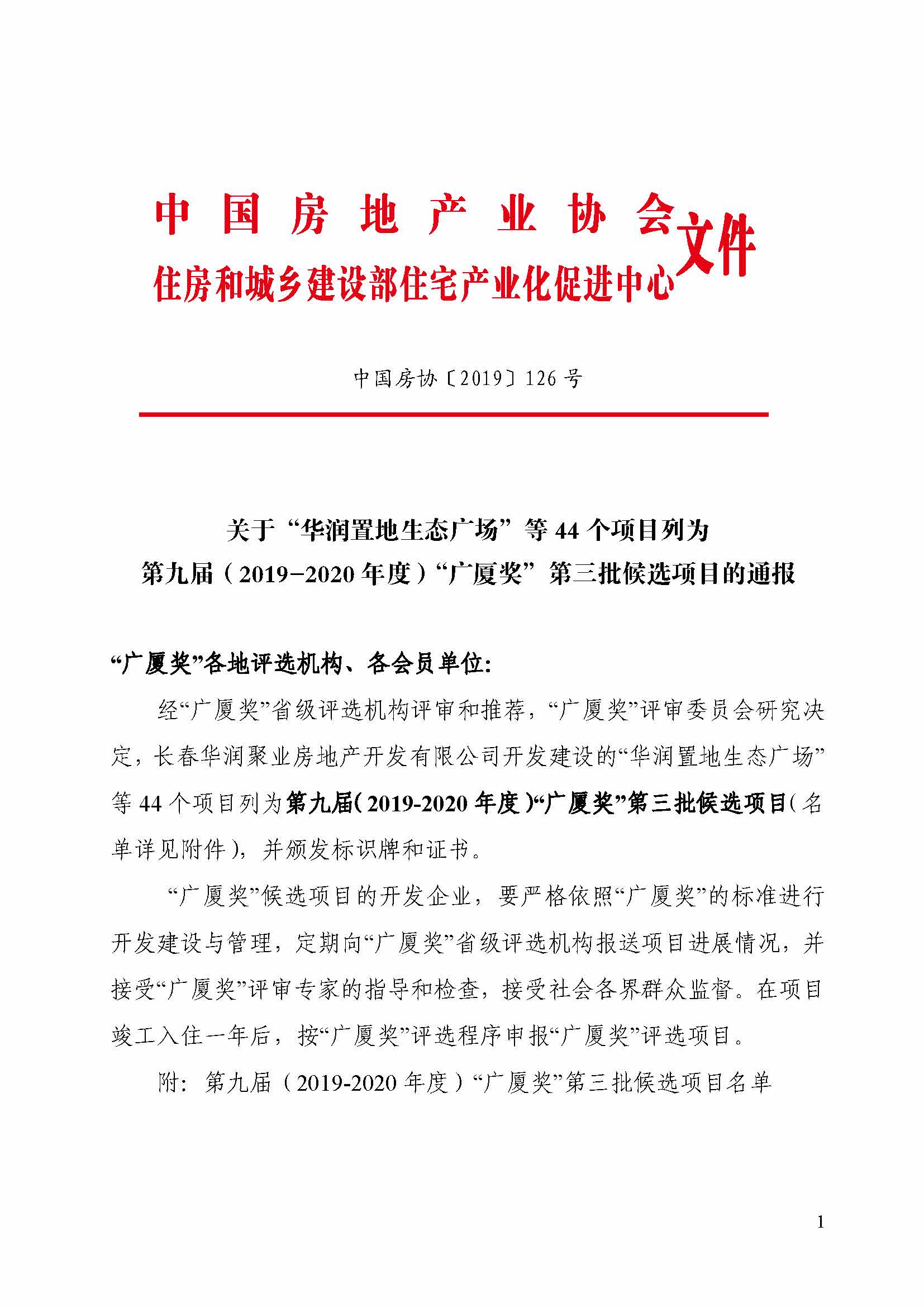关于“华润置地生态广场”等 44 个项目列为第九届(2019-2020 年度)“广厦奖”第三批候选项目的通报